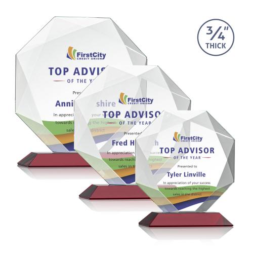 Elevate your recognition event with the Gregory Full Color Red Polygon Crystal Trophy, a masterpiece of precision and elegance. Crafted from premium crystal, this 0.75" thick multifaceted starfire award showcases an exquisite octagonal design, accented by deep recessed bevels that form a captivating diamond effect. Its striking form is enhanced by a sophisticated red crystal base, providing a stable and stylish foundation. Ideal for personalizations, the trophy offers a full-color VividPrint option to ensure that your message and branding stand out brilliantly. Perfect for corporate awards, it is an exceptional way to acknowledge outstanding achievements with a touch of class and color.