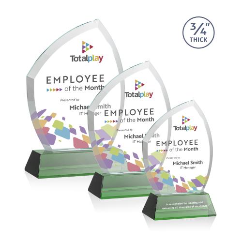 The Wilco Full Color on Helton Base Green Unique Crystal Trophy is a stunning choice for honoring outstanding achievements. Crafted from elegant Starfire Crystal, this award features a beautifully curved beveled frame that exudes sophistication. Its unique design is complemented by a tall, tapered base available in eight vibrant colors, allowing for a personalized touch. The trophy's full-color VividPrint ensures your message of recognition stands out prominently, while an optional second position imprint offers additional customization. Perfect for corporate recognition, this 3/4" thick crystal award is a memorable way to celebrate excellence and inspire continued success.