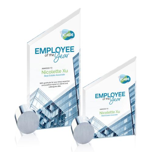 Introducing the Trevino Full Color Starfire/Chrome Circle Peaks Crystal Trophy, a stunning symbol of achievement that combines elegance and modern design. Crafted with a slant-topped 3/8" thick starfire crystal, this trophy features beautifully beveled edges, and is supported by a sturdy aluminum corner disk available in either a gold or silver finish. Its unique peaks and circle shape add a contemporary touch, making it perfect for recognizing outstanding accomplishments. Personalize it to commemorate excellence in any field, ensuring that each accolade is uniquely memorable. Ideal for corporate recognitions or special occasions, this trophy promises to shine as a cherished keepsake.