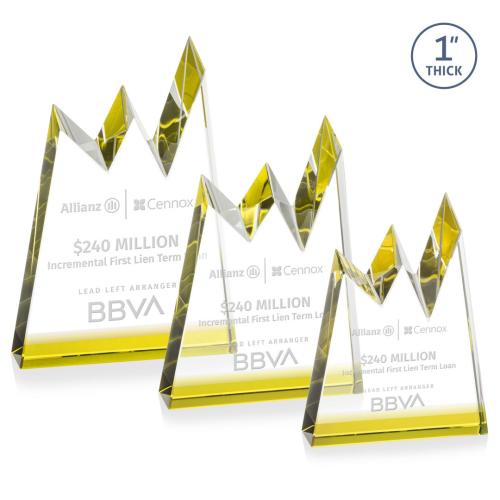 Celebrate exceptional achievements with the Alpine Gold Peaks Crystal Trophy, a breathtaking symbol of triumph and excellence. Crafted from high-quality optical crystal, this freestanding award features chiseled mountain peaks that evoke a sense of reaching new heights. Its clear or colored base radiates striking hues throughout the crystal, adding an elegant touch that captivates and inspires. Perfect for corporate recognition or honoring outstanding accomplishments, this trophy embodies strength and success, making it an unforgettable gift for those who excel. Its polished design and customizable options ensure it stands as a personalized testament to greatness.