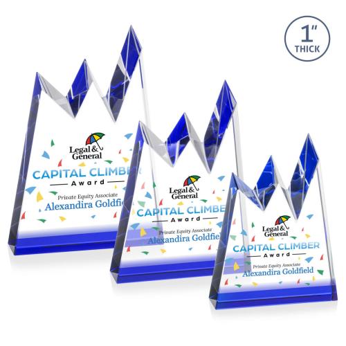 Capture remarkable achievements with the Alpine Full Color Blue Peaks Crystal Trophy, a premium accolade that symbolically mirrors lofty aspirations. This freestanding award, crafted from pristine optical crystal, showcases intricately chiseled mountain peaks that embody strength and success. Its vibrant blue base enhances the dazzling VividPrint™ technology, allowing your personalized logo and message to shine in full color. Perfect for commemorating those who reach the pinnacle of excellence, this exquisite trophy stands as a testament to extraordinary accomplishments. Ideal for any recognition occasion, it's a stunning way to honor those who inspire and lead.