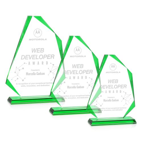 The Hillmont Green Unique Crystal Trophy is an exceptional choice for recognizing outstanding achievements and exceptional contributions. Crafted from radiant Starfire crystal, its distinctive polygon design features striking green edges that perfectly complement its robust base. This award is a splendid way to celebrate excellence and innovation, ideal for honoring top achievers and industry leaders. Available in sapphire, emerald, ruby, or gold, it offers a personalized touch to suit any occasion. Each trophy arrives blank, ready to be customized with your heartfelt message, ensuring a meaningful and timeless tribute to success.