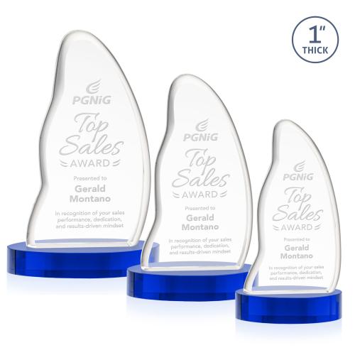 The Beauford on Base Blue Unique Crystal Trophy is the perfect choice for those looking to celebrate achievement with elegance and distinction. Crafted from premium optic crystal, its unique waved edge design creates a sense of movement and style, capturing attention from every angle. Mounted on an elegant blue optical crystal oval base, this award stands out as a sophisticated testament to success and dedication. Ideal for corporate recognition, this trophy's sleek and contemporary design complements any presentation setting. Customize it to add a personal touch and honor your recipients with a truly memorable keepsake.