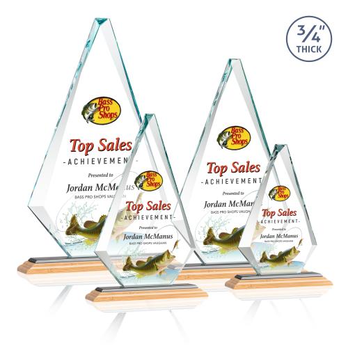 Introducing the Crowell Full Color Bamboo/Black Diamond Wood Trophy, an exceptional choice for honoring outstanding achievements. This elegant award features a stunning 0.75" thick Starfire Crystal diamond, meticulously crafted with sparkling bevels to capture and reflect light beautifully. It sits gracefully atop a triple-stepped bamboo base, offering a harmonious blend of natural aesthetics and modern design. Perfect for corporate recognition, the trophy allows you to elevate your personalization with full-color VividPrint, making each piece truly unique. Versatile with various base options, this exquisite trophy is designed to leave a lasting impression, celebrating the achievements of your team with style and elegance.
