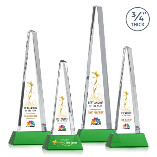 Celebrate remarkable achievements with the Womack Tower Full Color on Helton Base Crystal Trophy, a stunning symbol of excellence. Crafted from premium 3/4" thick Starfire Crystal, this elegant tower design stands proudly on a Starfire Crystal Newhaven base. Its pyramid shape, paired with a vibrant green Helton base, commands attention and admiration. Perfect for personal or corporate recognition, this versatile award can be customized with optional colorfill to enhance its visual impact and a second position for additional personalization. This trophy is not just an award-it's a memorable tribute to exceptional accomplishments.
