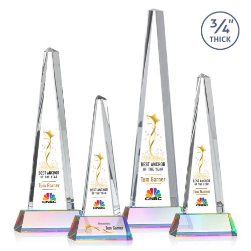 Celebrate outstanding achievements with the Womack Tower Full Color on Helton Prismatic Towers Crystal Trophy. Crafted from stunning 3/4" thick Starfire Crystal, this award features a sleek tower design elegantly perched on a Starfire Crystal Newhaven base. Its towering presence is a perfect tribute to monumental success. With the option for VividPrint color customization, personalize this trophy to make each recognition truly special. Whether for corporate accolades or personal milestones, this crystal trophy adds a touch of sophistication and distinctive brilliance to any award ceremony.