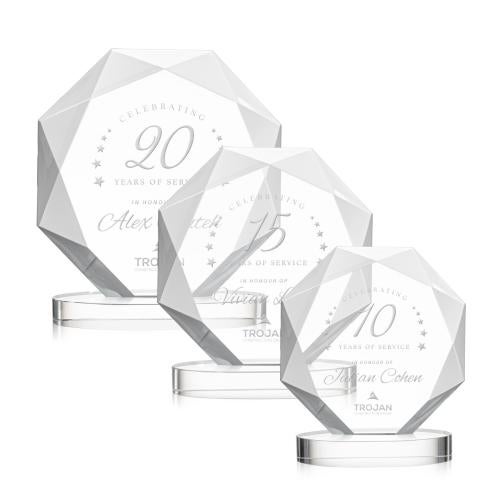 The Minor on Alberton Base Clear Polygon Crystal Trophy is a stunning testament to achievement and excellence, perfect for honoring significant milestones. Crafted from high-quality crystal, its striking starfire octagon design beautifully refracts light, creating a captivating display that highlights the recipient's accomplishments. This elegant award is customizable, allowing for personal engravings that add a personal touch to its already impressive presence. Available in three sizes and paired with your choice among nine different colored Alberton bases, this trophy is not only a symbol of recognition but also a sophisticated piece of art that stands out in any setting. Ideal for corporate awards, it balances formality with flair, making it a cherished keepsake for any recipient.