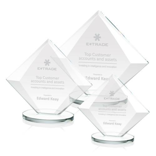 Celebrate achievement with the stunning Cronin Clear Diamond Crystal Trophy. Crafted from high-quality crystal, its diamond-shaped design features striking bevels that taper elegantly from the center to both the bottom and peak, creating brilliant reflections that catch the eye. The trophy's 3/8" starfire upright beautifully frames the central area, perfect for personalized etching, and stands on a sleek, circular starfire base. Available in three sizes, this trophy is an ideal choice for recognizing excellence and making a lasting impression at any awards ceremony or corporate event.