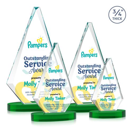 Introducing the Crowell Full Color on Alberton Base Green Crystal Trophy, a masterpiece in recognition awards that combines elegance with a personalized touch. Crafted from 0.75" thick Starfire Crystal, this award features a striking diamond shape that captures light beautifully, highlighting its sparkling bevels. It's mounted on a stunning green Alberton base that adds a sophisticated touch. Perfect for honoring achievements in a corporate setting, its classic design ensures your message stands out with vivid, full-color printing. This trophy offers a blank canvas for your unique customization, ready to celebrate milestones and inspire excellence.