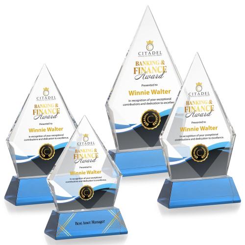 The Shelton Full Color on Helton Base Sky Blue Crystal Trophy is a masterpiece of elegance and ambition, perfect for celebrating outstanding achievements. Crafted from premium optical crystal, this award features a striking diamond shape with an elongated peak, symbolizing excellence and determination. Its polished bottom bevels add a touch of sophistication, making it an ideal choice for recognizing top performers. The trophy stands proudly on a tall, tapered Helton base in a sky blue hue, offering a modern twist to a classic design. With VividPrint™ customization options, each award can be personalized to reflect your unique message, ensuring a truly special and memorable tribute to success.