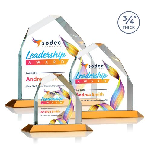 Celebrate exceptional achievements with the McDonald Peak Full Color Amber Peaks Crystal Trophy. Crafted from pristine crystal and designed with striking peaks in a vivid amber hue, this award stands as a testament to excellence and leadership. Each piece is beautifully blank and ready for full-color customization, ensuring a personalized recognition experience. The 3/4" thick crystal provides a substantial and elegant presence, making it an ideal choice for honoring outstanding performance or commemorating special milestones. Embrace the opportunity to inspire and honor with a trophy that captures the essence of success and dedication.