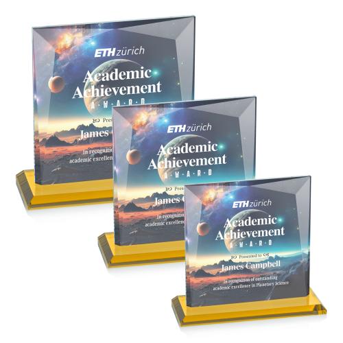 Celebrate excellence with the Paulson Full Color Amber Square/Cube Crystal Trophy, an elegant choice for recognizing outstanding achievements. Crafted from premium 0.75" thick Starfire Crystal, this award boasts deep divergent bevels that enhance its striking appearance. It stands proudly on a robust, colored mitered base, adding a touch of sophistication. Perfect for any occasion, the customizable VividPrint™ feature allows you to bring your unique artwork to life in stunning full color. Available in three sizes, this trophy is more than just a token of appreciation; it's a timeless piece that symbolizes success and dedication.