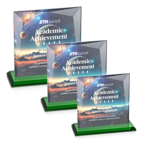 Introducing the Paulson Full Color Green Square/Cube Crystal Trophy, a stunning award perfect for celebrating outstanding achievements with elegance and style. Crafted from premium 0.75" thick Starfire Crystal, this trophy showcases deep, divergent bevels that intricately play with light, creating a mesmerizing display. Available in three sizes, each piece rests on a substantial colored mitered base, adding a vibrant touch to its formidable presence. Personalize it with your unique message using the vivid color imprinting option, ensuring that your recognition is both memorable and heartfelt. Ideal for academic or professional acknowledgments, this crystal trophy stands as a beacon of excellence and prestige.