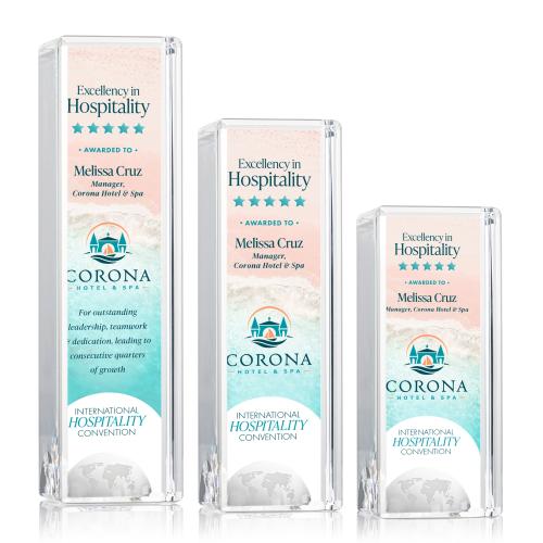 Honor global excellence with the Waddell Globe Tower Full Color Crystal Trophy, a striking symbol of achievement and recognition. This eye-catching award stands proudly with its thick optical crystal composition, featuring an intricately molded globe at its foundation-a testament to international or worldly accomplishments. The award's height and clarity make a bold statement, while the opportunity for full-color VividPrint personalization allows you to showcase your message or logo with vibrant precision. Each trophy is thoughtfully packaged in a satin-lined presentation gift box, enhancing the ceremonial experience for recipients. Ideal for acknowledging remarkable contributions in any field, this crystal trophy is a tangible reminder that success knows no boundaries.