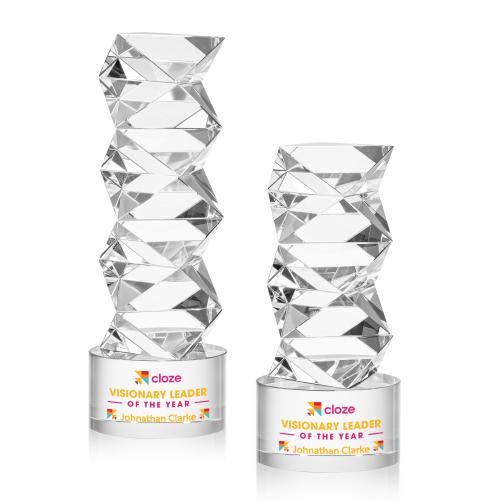 Introducing the Callucci Full Color on Round Base Clear Towers Crystal Trophy, a stunning testament to innovation and achievement. Crafted from pure optical crystal, this award features a dynamic tower design with interchanging cuts that brilliantly capture and refract light. The elegant, stacked geometric shape symbolizes forward motion and modern success, making it a perfect choice for recognizing excellence in any industry. Each award includes a solid crystal base, offering ample space for personalized engraving, ensuring a unique tribute to its recipient. Perfect for making any celebration of success truly memorable.