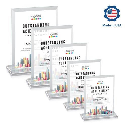 Celebrate achievements with elegance using the Villa Full Color Rectangle Crystal Trophy. Crafted from premium crystal, this award combines a beveled Starfire rectangle with chic optical crystal, creating a striking, modern design that is perfect for recognizing exceptional accomplishments. The trophy's clear, polished surface is ideal for vibrant customization, allowing you to add a personal touch that transforms it into a cherished keepsake. Manufactured and decorated in the USA, this award not only upholds superior quality standards but also offers a timeless aesthetic that fits any occasion, making it an ideal choice for honoring outstanding success in style.