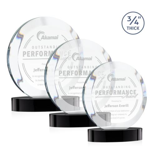 Introducing the Delarosa on Alberton Base Black Circle Crystal Trophy, an exquisite symbol of achievement and recognition. Crafted from premium crystal, the award features a striking 3/4" thick Starfire circle, elegantly outlined by a finely beveled edge to enhance your personalized message of excellence. This sophisticated piece is mounted on a sleek black oval crystal base, offering a touch of classic elegance that complements any decor. Perfect for celebrating outstanding performance and milestones, this trophy is a memorable keepsake that reflects dedication and success. Personalize it to make each award truly unique and significant.