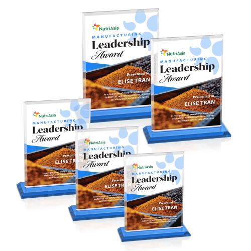 Celebrate achievements with the Lorenzo Full Color Sky Blue Rectangle Crystal Trophy, a stunning choice for any recognition event. This elegant award features a sleek rectangle design framed by beveled edges, perfectly mounted on a Starfire base that enhances its sophisticated look. Crafted from high-quality crystal, this trophy allows your personalized artwork to shine with full-color VividPrint, ensuring vibrant and lasting impressions. Ideal for corporate or personal accolades, the Lorenzo Trophy offers a distinguished way to honor excellence and make recipients feel truly special.