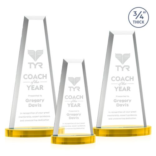 Introducing the Barrios Tower on Alberton Base in Gold-a stunning choice for your corporate recognition needs. This elegant award is crafted from 0.75" thick Starfire Crystal, forming a majestic tower that captures attention with its refined bevels. The crystal sits atop a luxurious gold Alberton base, adding an extra touch of opulence to this outstanding piece. Perfect for celebrating exceptional achievements, this award not only symbolizes excellence but also serves as a timeless keepsake. Customize it to create a truly personalized tribute for any deserving recipient.