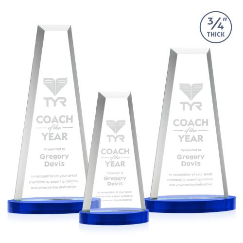 Celebrate exceptional achievements with the Barrios Tower on Alberton Base - Blue, a symbol of excellence and prestige. Crafted from high-quality Starfire Crystal, this stunning award features a 0.75-inch thick tower design with elegant beveled edges that catch the light beautifully. Resting atop a luxurious blue Alberton base, it offers a striking presentation that enhances any accomplishment. Perfect for corporate recognition or special occasions, this award starts blank, ready to be personalized with your unique message or logo, making it an outstanding gesture of appreciation and honor.