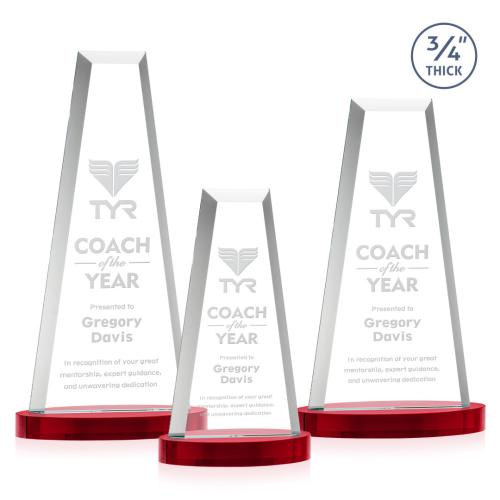 The Barrios Tower on Alberton Base - Red is an exquisite award crafted from premium 0.75" thick Starfire Crystal, making it an exceptional choice for recognizing achievements with elegance. Its sophisticated tower design features striking bevels, adding a touch of refined beauty to any accolade. Standing atop a rich red Alberton base, this award captures attention and admiration with its opulent presence. Ideal for personalization, the Barrios Tower serves as a blank canvas to honor excellence, making it a memorable and cherished tribute for any recipient.