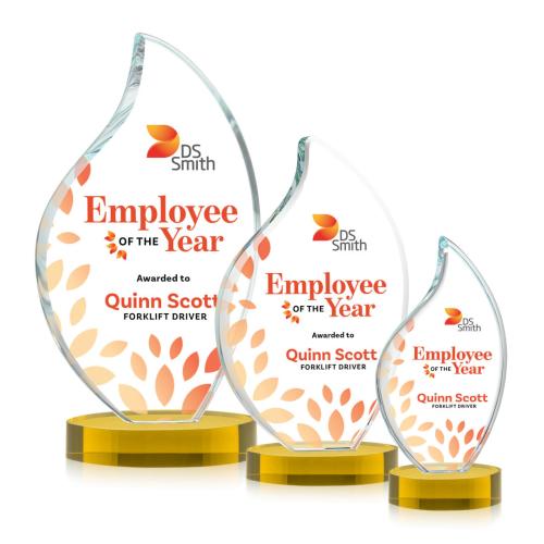 Celebrate outstanding achievements with the stunning Teague Full Color on Alberton Base Gold Flame Crystal Trophy. This elegant piece features a 3/4" thick Starfire Crystal VividPrint flame, with gracefully rounded edges, resting on a choice of clear or colored Alberton base. Perfect for honoring exceptional accomplishments, this trophy offers a remarkable way to make your personalized message and logo stand out with vivid, full-color printing. Crafted from high-quality crystal, its captivating flame shape symbolizes the brilliance and passion of any superstar. Ideal for corporate events, this trophy is the perfect gesture of recognition and appreciation.
