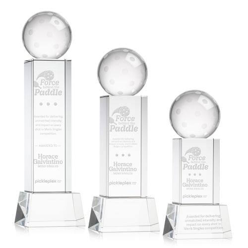 The Pickleball on Belcroft Base Clear Globe Crystal Trophy is a stunning tribute to the dedication and skill of pickleball enthusiasts. This exquisite award features a beautifully crafted optical crystal pickleball atop a sleek, clear base, capturing and refracting light in a mesmerizing display. Perfect for personalizing with a logo or name, it's an ideal choice for recognizing achievements in tournaments, competitions, or celebrating special occasions. The trophy's elegant design and high-quality crystal make it an outstanding keepsake, sure to be cherished by its recipient. Optional second-position etching allows for additional customization, ensuring each award is as unique as the individual it honors.