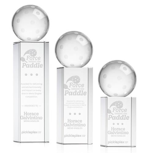 The Pickleball Globe on Yoder Base Crystal Trophy is a stunning celebration of excellence for pickleball enthusiasts. Crafted from high-quality optical crystal, this exquisite trophy features a beautifully detailed globe-shaped pickleball that dazzles with light from every angle. Its sleek design is mounted on a sophisticated base, perfect for adding personalized engravings, such as a logo or name, to commemorate achievements. Ideal for tournaments, competitions, or to honor a special player, this trophy is not just an award but a cherished keepsake that embodies athletic dedication and passion.