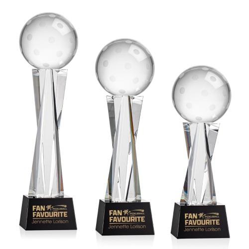 Introducing the Pickleball on Saldana Base Black Globe Crystal Trophy-a stunning tribute to the passion and skill of pickleball enthusiasts. This elegant award showcases a beautifully crafted optical crystal pickleball, designed to capture and reflect light in a mesmerizing display. It rests on an exquisite optical base, perfect for personalized engravings of logos or names, making it a standout piece for any event. An ideal choice for tournaments, competitions, or special celebrations, this trophy embodies excellence and achievement. Crafted entirely from premium crystal, its globe shape design adds a touch of sophistication, ensuring it becomes a cherished keepsake for any recipient.