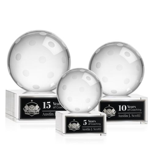 Celebrate the spirit of pickleball with our stunning Pickleball Globe on Plated Base Crystal Trophy. This elegant award features a flawlessly crafted optical crystal pickleball that beautifully captures and reflects light, making it a striking centerpiece. The globe sits atop a sleek, plated base, perfect for engraving a personal touch with a logo or name, ensuring it's a cherished memento for any pickleball enthusiast. Ideal for tournaments, competitions, or special achievements, this trophy serves as a lasting tribute to dedication and athletic excellence. Crafted entirely from high-quality crystal, it's as durable as it is dazzling.