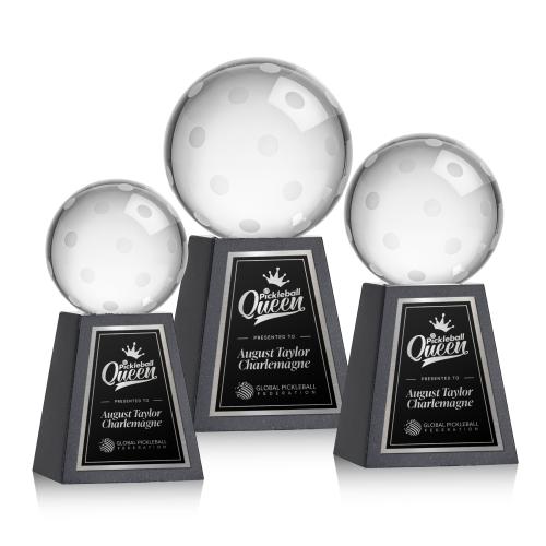 Celebrate the dedication and prowess of pickleball enthusiasts with our Pickleball Globe on Tall Marble Base Crystal Trophy. This stunning award features a meticulously crafted optical crystal pickleball globe that dazzles with every angle, capturing and refracting light beautifully. Positioned elegantly atop a tall marble base, it offers ample space for personalization with a logo or name, making it the perfect keepsake for tournaments, competitions, or special events. This award not only honors achievements but also serves as a striking piece of art, making it a cherished gift and a symbol of sportsmanship and excellence.