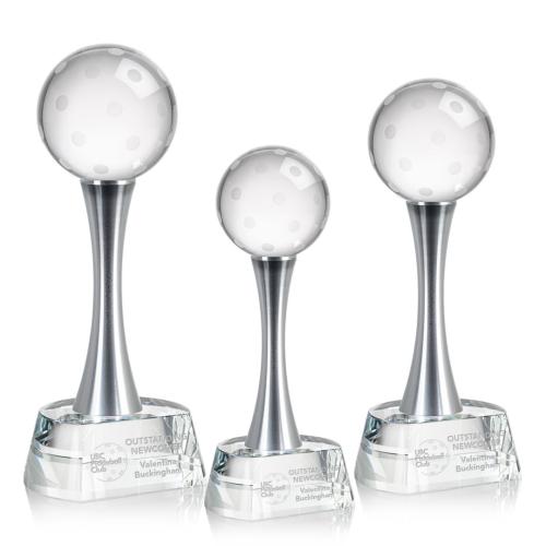 Introducing the Pickleball Globe on Metal Pedestal Base Crystal Trophy, an exquisite piece designed for devoted pickleball enthusiasts celebrating achievement and sportsmanship. This stunning award features a flawless optical crystal pickleball that beautifully captures and refracts light, creating a mesmerizing effect. It is elegantly perched on a sleek metal pedestal, allowing for personalization with a logo or name, making it a perfect choice for honoring champions at tournaments, competitions, or significant milestones. This trophy is not just a symbol of victory but also a timeless keepsake that pays homage to the dedication and athleticism of its recipients.