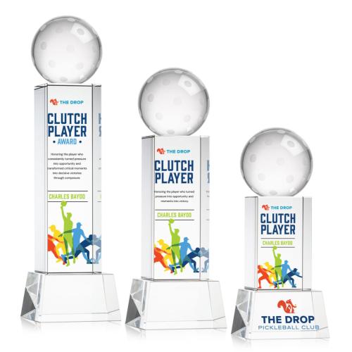 Celebrate the passion and skill of dedicated pickleball players with our exquisite Pickleball Full Color on Belcroft Base Clear Globe Crystal Trophy. This elegant award features a beautifully crafted optical crystal pickleball that mesmerizes with its light-catching brilliance. Set atop a sturdy optical base, it offers ample space for personalization with your logo or name, making it an ideal keepsake for tournaments and special events. Our full-color VividPrint technology ensures your custom designs are vibrant and eye-catching. Whether given as a prestigious award or memorable gift, this trophy perfectly honors achievements in the spirited world of pickleball.