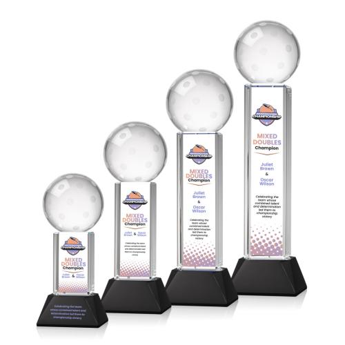 Introducing the Pickleball Full Color on Tower Base Black Globe Crystal Trophy â a stunning homage to the passion and skill of pickleball enthusiasts. Crafted from pristine optical crystal, this elegant award features a beautifully detailed globe design that captures and refracts light, creating a mesmerizing display. The sleek black tower base offers a perfect space for personalization with your logo or recipient's name, making it an exceptional gift or keepsake for tournaments and special occasions. Enhanced by vibrant VividPrint, this trophy is more than just an award; it's a celebration of achievement and dedication. Make your event memorable with this exquisite symbol of success.