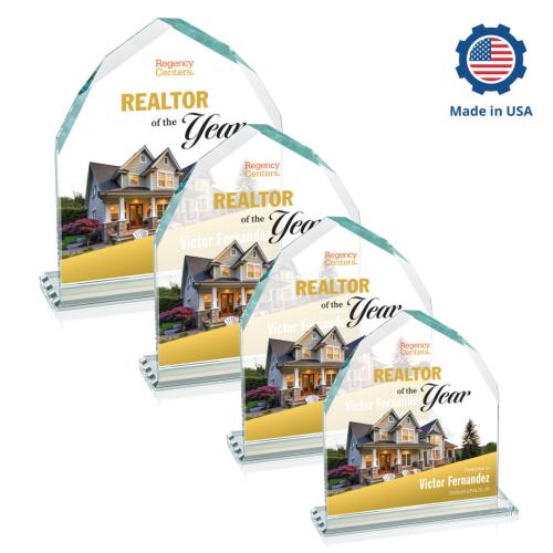 Elevate your recognition ceremonies with the stunning Emery Full Color Peaks Crystal Trophy. This exquisite award is crafted from high-quality Starfire crystal, featuring unique interchanging front and back facing bevels that create a striking visual impact. Its elegant peaks design, mounted on a matching beveled Starfire base, acts as a perfect canvas for our advanced full-color VividPrint technology, bringing your personalized artwork to life. Proudly manufactured and decorated in the USA, this trophy is ideal for celebrating achievements with style and sophistication. Whether for corporate success or personal accomplishment, this award offers a beautiful way to honor excellence.
