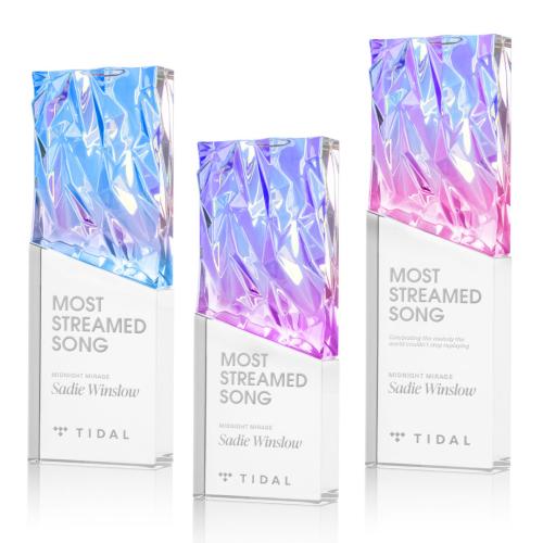 Discover a truly captivating way to honor excellence with the Ophelia Clear Rectangle Crystal Trophy. Crafted from premium optical crystal, this award exemplifies contemporary elegance with its sleek, polished base and stunning, textured crown. The top portion is artistically faceted to refract light into vibrant, rainbow hues, creating an unforgettable display of color and brilliance. Perfect for celebrating outstanding achievements, the Ophelia Trophy is an ideal choice for those who value both beauty and prestige. Personalize it to add a special touch to your recognition ceremony, ensuring each recipient feels uniquely honored.
