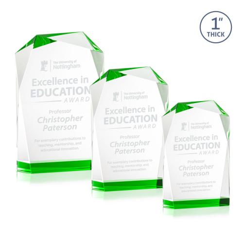 Introducing the Donvale Green Unique Crystal Trophy, a stunning tribute to excellence in any field. This award captivates with its modern geometric shape and flawless optical crystal construction. The vibrant emerald accent at the base adds a splash of color that elegantly reflects throughout the trophy's beveled edges. Available in three sizes, its asymmetrical design catches the light brilliantly, ensuring every accolade is celebrated with sophistication and contemporary flair. Ideal for corporate recognition, this trophy starts undecorated, ready to be personalized into a cherished keepsake that celebrates outstanding achievements.