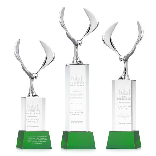 Elevate any recognition ceremony with the Maverick Eagle on Belcroft Base Green Animals Crystal Trophy. Featuring a stunning chrome eagle in full flight, this award embodies vision, freedom, and achievement. Its dynamic wingspan rests elegantly atop an optic crystal base, available in various shapes, adding both strength and sophistication to its presentation. Perfect for honoring excellence, this trophy can be personalized with optional etching to make a lasting impression. Crafted with premium crystal and metal, it's a striking symbol of accomplishment that stands out in any setting.