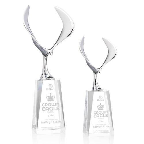 Celebrate outstanding achievements with the Maverick Eagle on Chandler Base Crystal Trophy, a stunning tribute crafted for those who soar above the rest. Featuring a breathtaking chrome eagle with dynamic wings, this award symbolizes vision, freedom, and success. Perched on a sophisticated Optic Crystal base, available in various shapes to suit your unique recognition style, this trophy combines strength and elegance into an unforgettable keepsake. Crafted from premium crystal and metal, it exudes a timeless brilliance that captures the spirit of excellence in every detail. Ideal for personalization, it's the perfect choice to honor extraordinary accomplishments with a touch of prestige.
