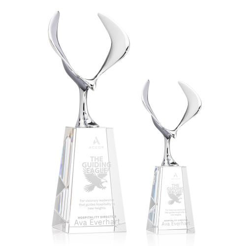 The Maverick Eagle on Tall Base Clear Crystal Trophy is an exceptional symbol of achievement and excellence, perfect for honoring those with visionary spirit. Featuring a soaring chrome eagle, this award embodies freedom and ambition. Its elegant Optic Crystal base, available in various shapes and finishes, offers a touch of sophistication to complement any recognition occasion. Crafted from premium crystal and metal, this trophy not only serves as a stunning centerpiece but also as a meaningful keepsake, ideal for celebrating outstanding accomplishments. The blank canvas allows for personalized engraving, making each piece a unique tribute to success.
