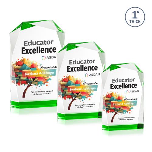 Elevate your recognition ceremonies with the Donvale Full Color Green Unique Crystal Trophy. This exquisite award, crafted from high-quality optical crystal, features a modern geometric design with asymmetrical beveled edges. The vibrant emerald accent at the base beautifully reflects through the top, creating a striking visual display. Perfect for celebrating excellence, this trophy is available in three sizes, offering a sophisticated and contemporary touch to any occasion. Personalize it with our full-color VividPrint to make your achievement truly stand out. Ideal for those looking to honor special achievements in a memorable way.