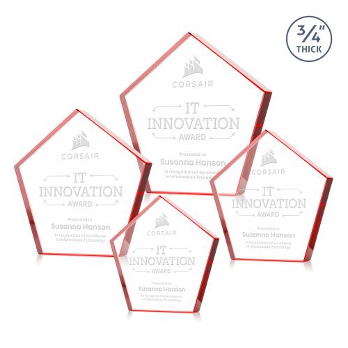 Introducing the Belmar Steiner Red Polygon Crystal Trophy, a striking symbol of recognition crafted for those who deserve the spotlight. With its bold, freestanding design, this award features a substantial 0.75-inch thickness and a modern pentagon shape, making it a standout piece for celebrating achievements in corporate and technology fields. The crystal's precision-cut edges and vibrant red accents offer a contemporary flair, emphasizing innovation and impact. While the image showcases example personalization, each trophy begins as a blank canvas, ready to be customized with heartfelt messages or names, turning it into a unique tribute to success and excellence.