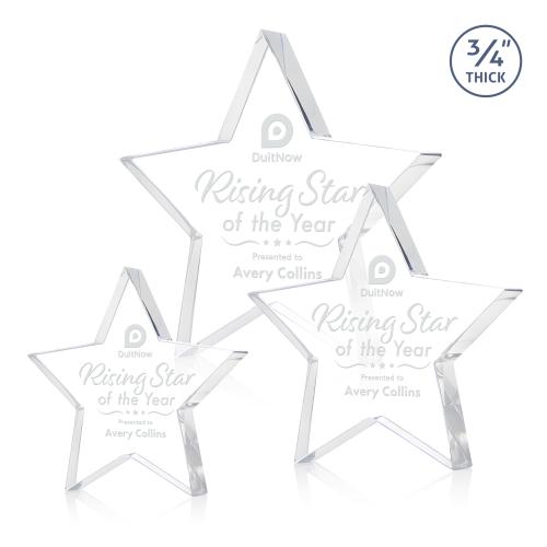 Celebrate excellence and rising talent with the Esna Star Clear Crystal Trophy, a stunning symbol of achievement. This freestanding award is crafted from .75-inch thick Starfire crystal, featuring a bold star silhouette that catches and reflects light beautifully. Its precision-cut edges add a touch of brilliance, making it a memorable accolade for standout performances. Available with accents in clear, gold, emerald, ruby, or sapphire, this trophy offers a polished and impactful way to honor success. Ideal for recognizing exceptional accomplishments, the Esna Star Trophy conveys a sense of forward momentum and lasting recognition. Personalize it to add a special touch to this timeless award.