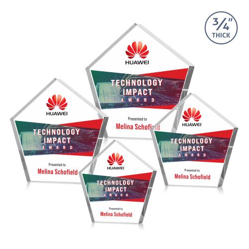 The Belmar Steiner Full Color Clear Polygon Crystal Trophy is a stunning recognition piece that combines modern design with timeless elegance. Crafted from .75â³ thick Starfire crystal, this trophy features a sleek pentagon shape with precisely cut edges, offering a refined structure that speaks volumes of sophistication. Its substantial and clear crystal surface provides an impressive backdrop for vivid full-color graphics and custom branding, allowing your achievements to stand out with clarity. Ideal for acknowledging excellence in corporate or technological fields, the trophy's contemporary design is enhanced by optional clear or colored edge accents, making it a perfect tribute to innovation and outstanding impact. Celebrate your milestones with this exquisite award that begins as a blank canvas, ready to be personalized to mirror your accomplishments.
