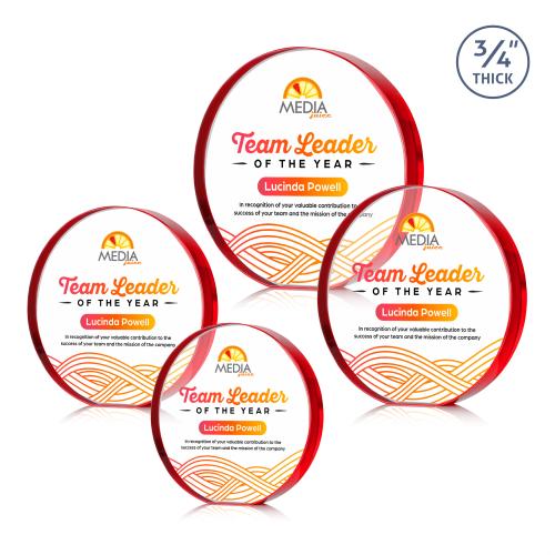 Celebrate exceptional achievements with the stunning McMahon Full Color Red Circle Crystal Trophy. This elegant 3/4" thick, freestanding starfire crystal award serves as a perfect tribute to highlight significant accomplishments or to honor an outstanding performer. The circular design, combined with our advanced full-color VividPrint technology, allows you to bring your personalized artwork to life, creating a truly unique and memorable keepsake. Ideal for desktops, this crystal trophy is a sophisticated and inspiring way to acknowledge excellence, making it a cherished reminder of success and dedication.