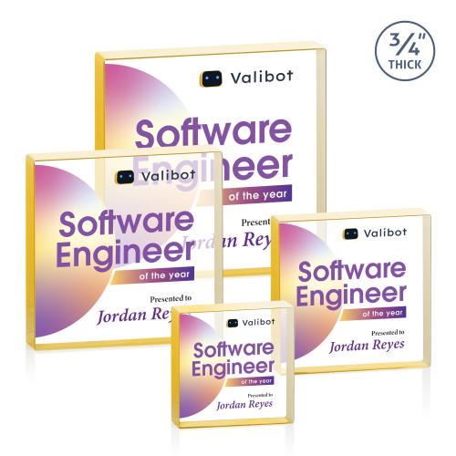 The Upton Square Full Color Gold Crystal Trophy is a sophisticated choice for celebrating remarkable achievements. Crafted from premium 3/4" thick Starfire crystal, this award features a modern square silhouette with polished edges for a bold and elegant display. Standing out with its substantial depth, it commands attention wherever it is displayed. Available in various hues, including clear, sapphire, emerald, ruby, and gold, this trophy adds a personal touch to any recognition ceremony. With the capability for full-color VividPrint customization, you can bring your artwork to life, making this trophy a truly personalized tribute. Ideal for any desk or award display, it embodies prestige and achievement.