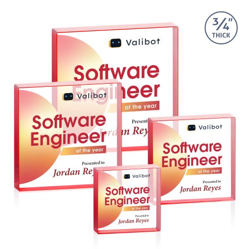 Celebrate exceptional achievements with the Upton Square Full Color Crystal Trophy, a stunning embodiment of contemporary elegance. Expertly crafted from 3/4" thick premium Starfire crystal, this award boasts clean lines and a striking square silhouette that make a powerful statement on any desk or display. Available in a vibrant red hue among other captivating colors like clear, sapphire, emerald, ruby, and gold, the trophy's substantial depth and polished edges enhance its sophisticated appeal. Perfect for customization through full-color VividPrint, this remarkable piece provides a refined way to honor excellence and make lasting impressions.