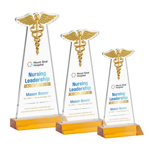 Celebrate excellence in healthcare with the stunning Caduceus Full Color Amber Unique Crystal Trophy. Crafted from premium Starfire crystal, this award features a finely detailed Caduceus figure, symbolizing the care, knowledge, and healing innate to medical professions. Its sleek, tapered design and brilliant clarity capture professionalism and prestige, making it an ideal choice for recognizing achievements in the medical, pharmaceutical, and wellness sectors. Physicians, nurses, researchers, and healthcare leaders will appreciate this meaningful tribute to their dedication and impact on health and patient care. Personalize it with VividPrint to make logos come alive, ensuring this award truly shines in any setting.