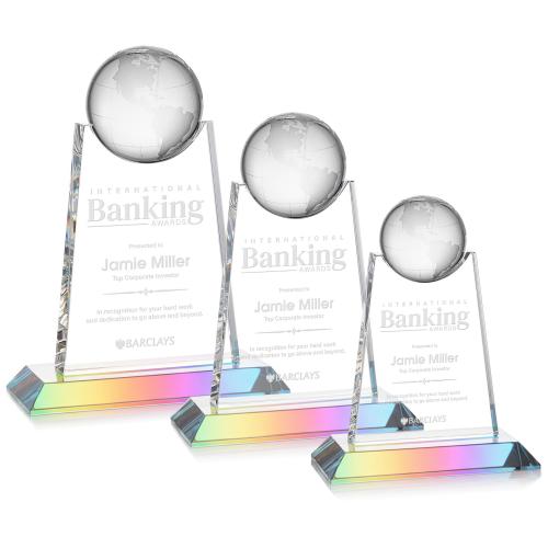 Introducing the Mayes Prismatic Globe Crystal Trophy, an exquisite tribute to global vision and international achievement. Skillfully crafted from premium optical crystal, this trophy features a tall, elegantly angled rectangular panel that gracefully supports a finely detailed crystal globe etched with subtle continental outlines. Mounted securely on a sleek, mitered base, this award not only offers stability but also enhances the dazzling brilliance of the crystal. Ideal for recognizing outstanding accomplishments, the Mayes Prismatic Globe Crystal Trophy adds a touch of prestige to any celebration and stands as a timeless symbol of success. Each piece begins blank, ready for your personalized touch to make it truly unique.