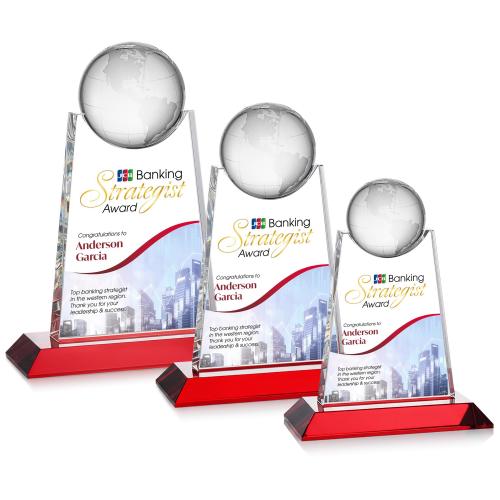Celebrate exceptional achievements with the Mayes Full Color Red Globe Crystal Trophy. Meticulously crafted from premium optical crystal, this award features a sleek, angled rectangular panel that elegantly supports a finely detailed crystal globe, etched with subtle continental outlines. Symbolizing global vision and international success, this trophy is perfect for honoring outstanding accomplishments. The vivid red mitered base not only offers stability but also enhances the trophy's stunning brilliance. Personalize it with vibrant full-color VividPrint, making logos and messages stand out beautifully. Ideal for recognizing excellence in a truly memorable way.